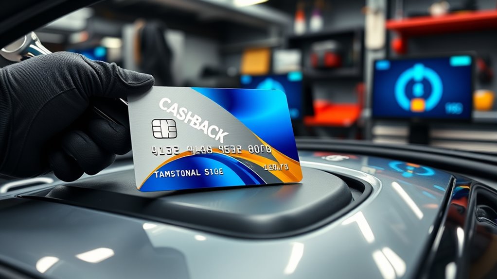 Using cashback and rewards credit cards for your car maintenance can help you earn points, cashback, or miles on expenses like oil changes, tire rotations, and repairs. Some cards even offer discounts on auto insurance or roadside assistance. By paying bills with these cards and maximizing bonus categories, you can lower your overall vehicle costs. Staying aware of your card benefits lets you make the most of these savings — discover how to optimize your rewards for better savings ahead.