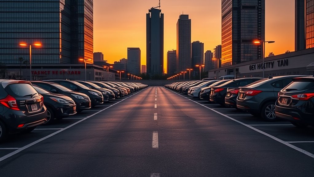 In urban areas, your parking surface greatly affects tire wear. Smooth, well-maintained pavement reduces strain and uneven tread damage, while rough, cracked, or sloped surfaces can accelerate tire deterioration. Keeping your tires properly inflated and checking pressure regularly helps prevent damage from city potholes and curbs. Consistently parking on good surfaces and maintaining your tires can extend their lifespan. To learn more about protecting your tires in the city, keep exploring these essential tips.