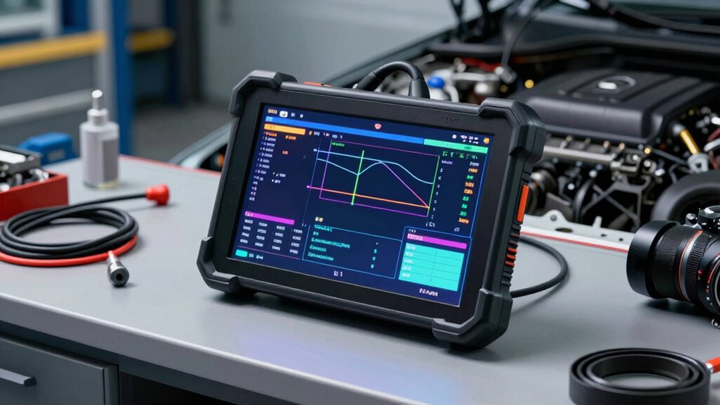Bidirectional scan tools are advanced diagnostic devices that allow you to communicate directly with a vehicle’s electronic systems. They work by utilizing specific network protocols to establish a connection between your device and the vehicle’s onboard computers. This communication enables you to send commands and retrieve real-time data, making diagnostics more precise. Device compatibility is essential, as not all scan tools support the same protocols or vehicle makes and models. Some tools are designed to work with multiple protocols, ensuring broader compatibility. By leveraging these protocols, bidirectional scan tools allow you to perform active tests, control modules, and verify system functions, transforming your diagnostic process from guesswork into targeted testing. This capability considerably improves troubleshooting efficiency and accuracy. Additionally, understanding the underlying digital concepts behind these tools can help you optimize their use and interpret data more effectively.