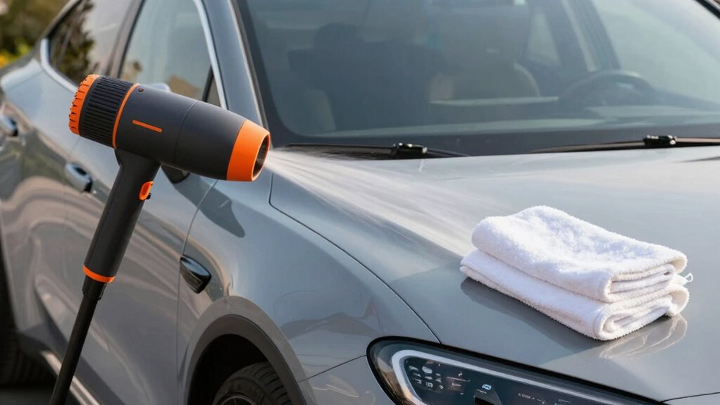 Air blowers can dry your car completely, but their efficiency depends on the blower’s power and design. They excel at removing most water quickly, reducing towel use. However, some residual moisture might remain in crevices or around intricate details. Using a soft, microfiber towel guarantees towel material safety and helps reach areas the blower might miss. Combining both methods provides a thorough, safe, and efficient drying process.