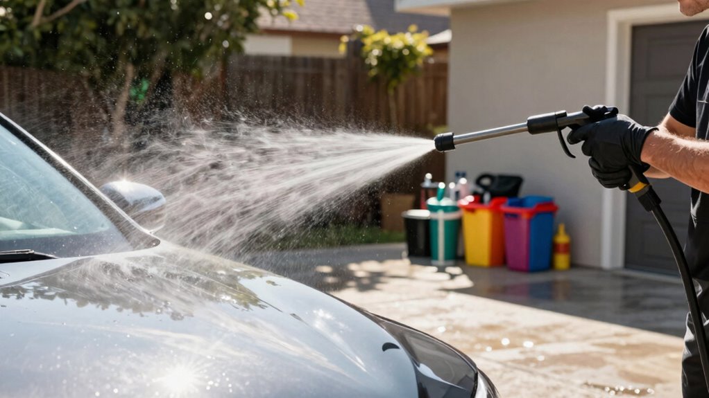 Wearing the right safety gear is essential to safeguard yourself and guarantee a successful car detailing session with your pressure washer. Proper protective gear keeps you safe from high-pressure water, debris, and splashes. Here are four key items to prioritize:
