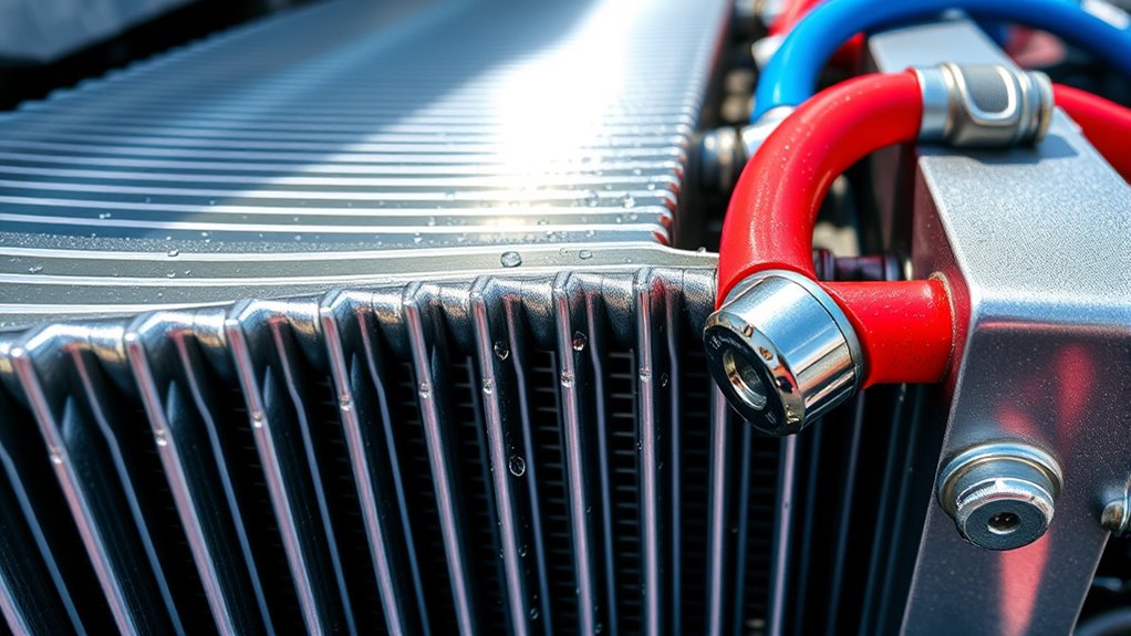 Radiators and cooling systems play a pivotal role in maintaining your vehicle’s engine temperature within ideal limits. When you start your engine, it generates a significant amount of heat through combustion and friction. Without an effective cooling system, this heat can build up rapidly, risking engine overheating and potential damage. Your radiator acts as the main component in this process, facilitating coolant circulation to keep things in check. Coolant, usually a mix of water and antifreeze, flows through the engine block, absorbing excess heat. As it circulates, it carries this heat away from the engine, preventing temperatures from climbing too high. This circulation is essential because it guarantees that heat dissipation happens efficiently, preventing localized hotspots that could cause engine failure. The radiator’s design maximizes heat dissipation by allowing the heated coolant to pass through narrow tubes and a large surface area of fins. As airflow moves through these fins, it cools the hot coolant by transferring heat from the liquid to the air, which then escapes into the environment. This process is continuous, with the radiator constantly exchanging heat to maintain a steady engine temperature. When the coolant reaches a certain temperature, a thermostat opens to let the circulating coolant flow into the radiator for cooling, then returns to the engine once it’s cooled down. This cycle keeps the engine operating within a safe temperature range, optimizing performance and efficiency. Your cooling system also relies on a water pump to maintain consistent coolant circulation. This pump ensures the coolant moves rapidly through the engine and radiator, preventing hot spots and ensuring uniform temperature regulation. If coolant flow slows or stops, heat dissipation becomes inefficient, and the engine can overheat quickly. That’s why maintaining proper coolant levels and checking for leaks is essential—any interruption in circulation compromises heat dissipation and risks engine damage. Proper coolant circulation is vital for engine health, ensuring the longevity and reliable operation of your vehicle.