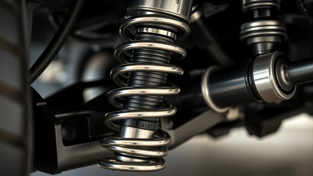 Equally important is understanding how spring material selection influences your suspension’s effectiveness. Springs support your vehicle’s weight, absorb shocks, and maintain proper ride height. They come in various materials, but the most common are steel alloys due to their strength and durability. When selecting spring materials, you want options that can withstand repeated compression and extension without losing their shape. High-quality steel alloys, such as chromoly or alloy steels, offer excellent fatigue resistance, meaning they last longer and perform reliably over time. The right spring material not only impacts ride comfort but also affects handling and safety, especially when carrying heavy loads or driving on uneven terrain.