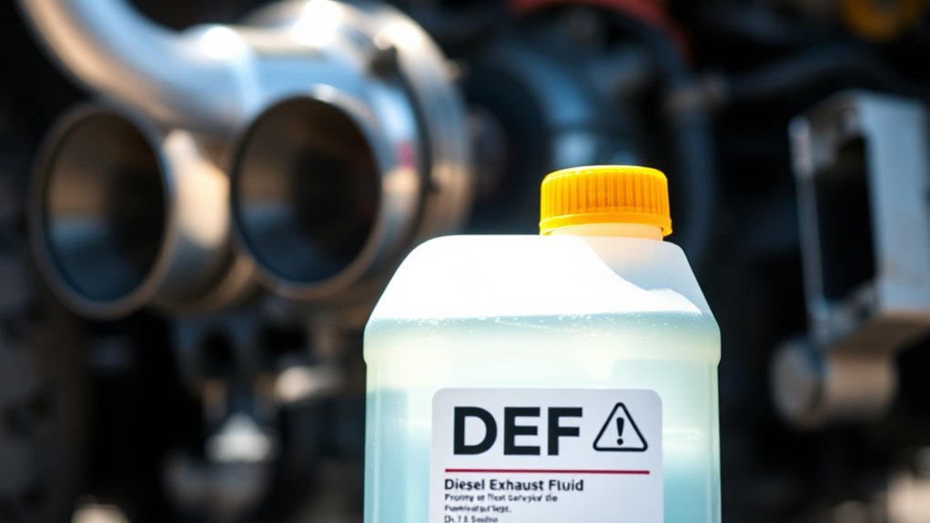 Remember, handling diesel exhaust fluid properly is key to keeping your vehicle running smoothly and protecting the environment. Always follow the recommended storage and usage guidelines, and never ignore signs of low DEF levels. As the saying goes, “A stitch in time saves nine.” By staying attentive and proactive, you guarantee your vehicle stays efficient and eco-friendly, avoiding costly repairs or penalties. Proper DEF management isn’t just a duty—it’s a smart choice for your car and the planet.