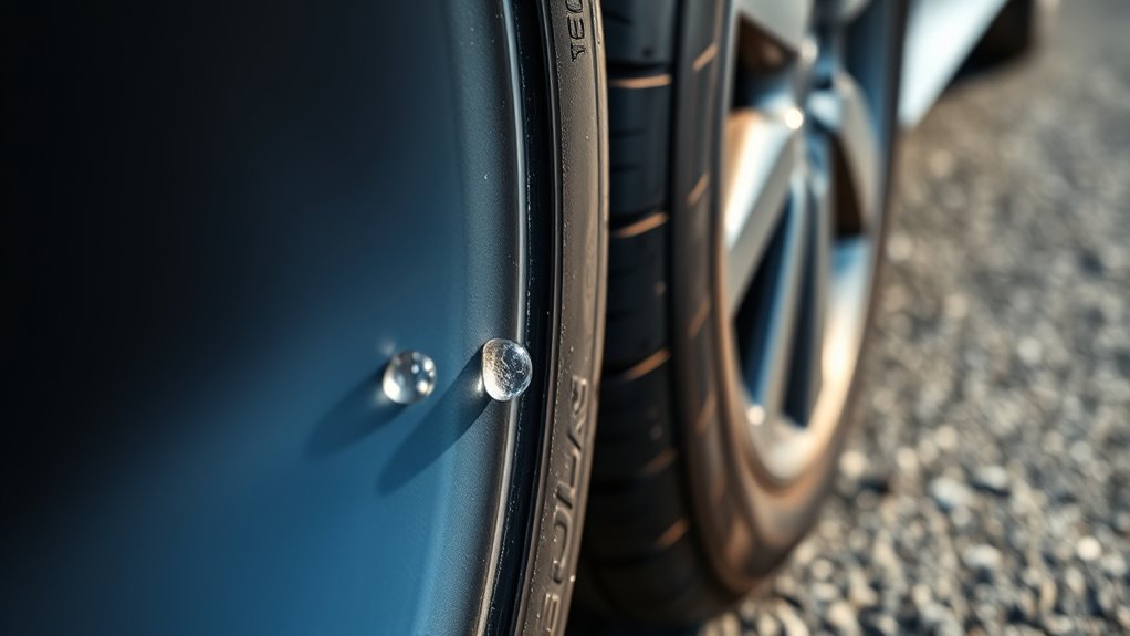 Using nitrogen helps maintain your tire pressure longer because it’s less prone to leakage compared to air. This pressure stability means your tires stay properly inflated, which can improve tire longevity and fuel efficiency. Over time, nitrogen’s inert properties prevent pressure fluctuations caused by temperature changes. So, with nitrogen, you spend less time adjusting tire pressure and enjoy consistent performance, ultimately extending the life of your tires.
