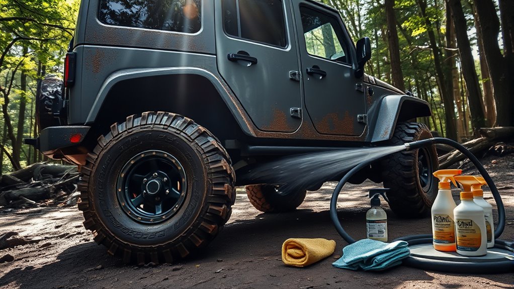 To prevent rust after off-road adventures, you should focus on rust prevention and undercarriage protection. Start by thoroughly washing your 4×4, especially the undercarriage, to remove mud, dirt, and salt. Apply a high-quality rust inhibitor or undercarriage spray to create a protective barrier. Regular inspections and touch-ups help maintain protection, ensuring your vehicle stays rust-free and ready for future adventures.