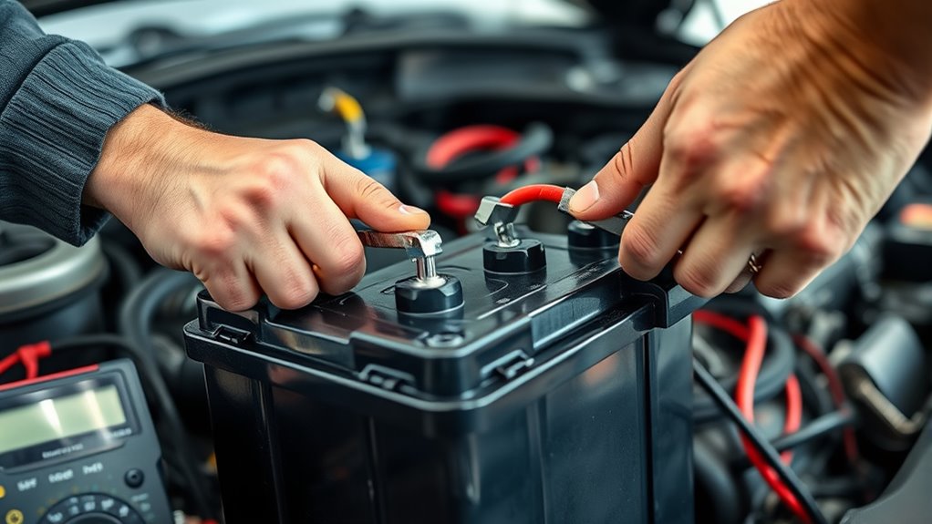 Reconnect the terminals starting with the positive (+) terminal first, tightening the clamp securely. Follow with the negative (-) terminal, also tightening it firmly to guarantee a solid connection. Double-check that all connections are tight and that the battery is properly secured in place. Afterward, start your vehicle to verify that everything works smoothly. Remember, maintaining your battery and checking for corrosion regularly can extend its lifespan and keep your car running reliably. Proper maintenance and timely replacements can also prevent breakdowns and ensure safety on the road.