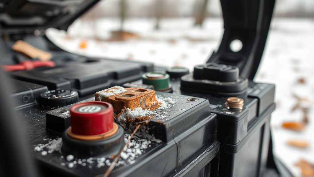 If your headlights dim or your engine cranks slowly, it could be an early sign your battery is failing, especially before winter hits. Dashboard warning lights might turn on, and corrosion on terminals can hinder performance. Cold weather puts extra strain on your battery, so catching issues early helps prevent breakdowns when you need your vehicle most. Stay vigilant — more tips to keep your battery healthy are just ahead.