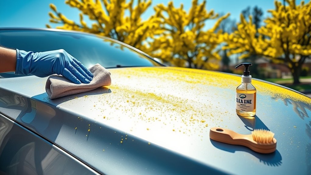 To prepare your car for pollen season, give it a thorough wash using gentle soap and microfiber cloths, paying attention to crevices and headlights. Maintain your air filtration system by replacing filters regularly, and consider using allergen-reducing options. Applying a protective wax helps create a barrier against pollen, while parking in shaded areas reduces buildup. For more tips on keeping your vehicle clean and protected, continue exploring effective strategies.