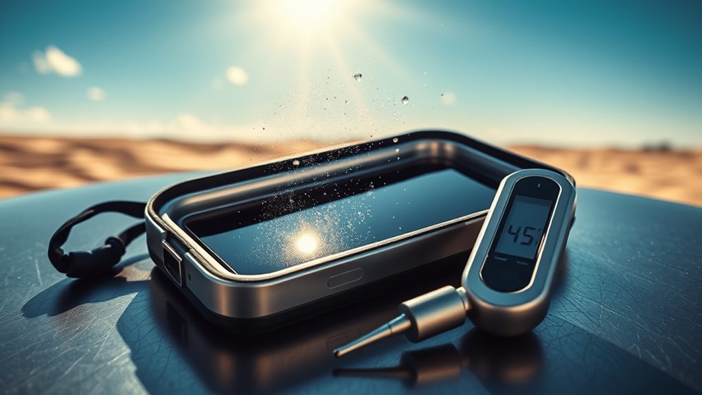 To safeguard your batteries and electronics in extreme heat, keep them in shaded, cool environments and avoid direct sunlight. Use thermal management techniques like fans, heat sinks, or insulation materials to reduce temperature spikes. Monitoring with sensors helps detect overheating early, preventing damage. Combining insulation with active cooling methods can extend device lifespan and ensure consistent performance. Want to learn more practical strategies to keep your devices safe in high temperatures?