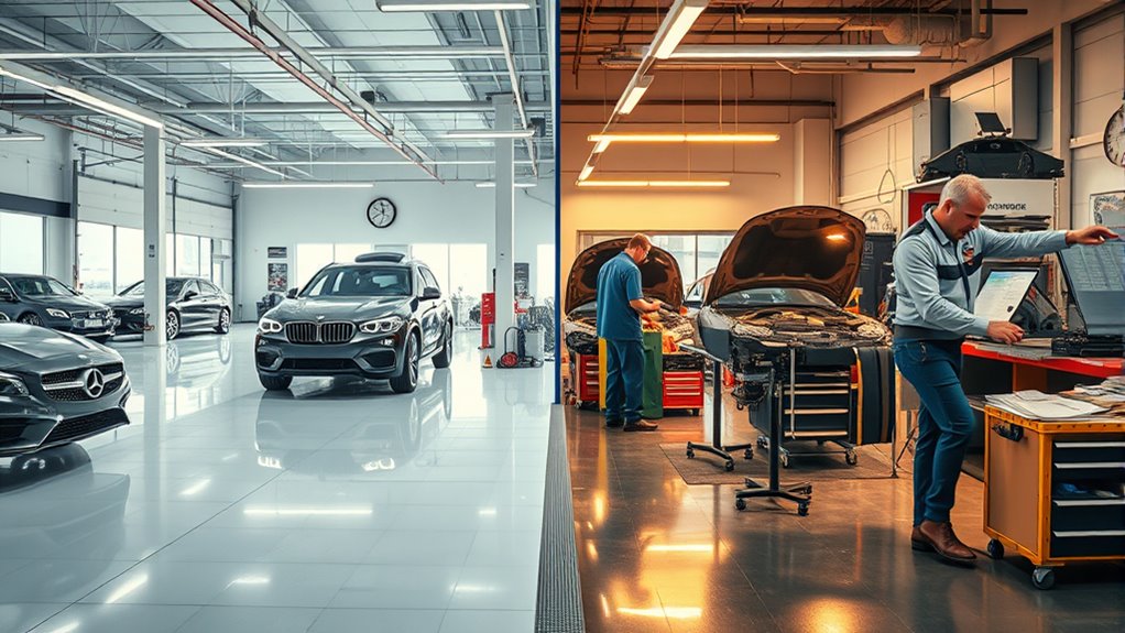 Dealer maintenance plans provide manufacturer-backed coverage with genuine parts and expert service, helping you keep your vehicle under warranty and retaining its resale value. Independent shops often offer more flexibility and lower prices but may have varied warranty guarantees. While dealer plans ensure your repairs meet manufacturer standards, independents might use OEM or aftermarket parts. To decide what’s best, consider your priorities—warranty protection, costs, or flexibility—and explore the key differences that could impact your vehicle’s care.