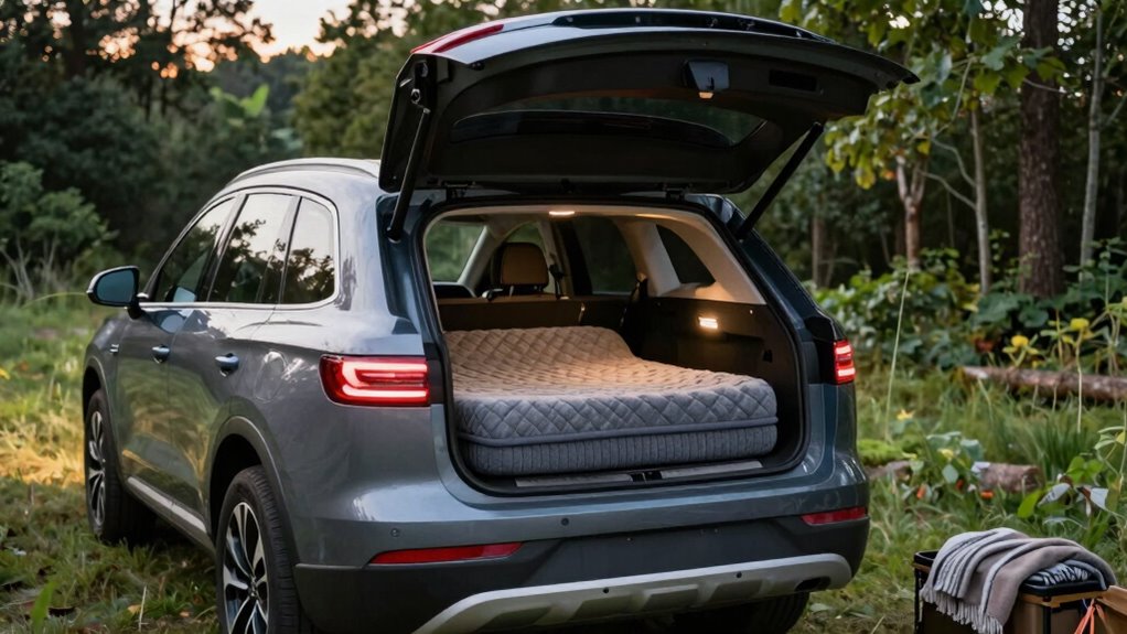 Selecting a car camping mattress that fits your SUV properly is key to a comfortable night’s sleep. First, measure your vehicle’s cargo space, which usually ranges from 5.4 to 6.07 feet in length. Make certain the mattress dimensions match or are slightly smaller to fit comfortably. Pay attention to design features like T-shaped or winged edges, which help the mattress adapt to wheel wells and other irregularities. Check the weight capacity, as most mattresses support at least 300 pounds, suitable for multiple sleepers. Also, consider models with multiple air chambers or separate inflation ports for flexibility in various configurations. Finally, verify if the mattress is designed specifically for your SUV model or offers a universal fit to guarantee ideal compatibility.