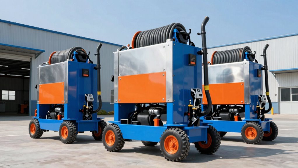 Imagine a sturdy shield guarding your equipment—that’s what modern skid mounts do with integrated safety features. I’ve seen models with automatic shut-offs if leaks occur, reinforced frames to prevent tipping, and safety valves to manage pressure surges. These thoughtful additions protect both the operator and the machine, giving me confidence when tackling tough jobs. Safety isn’t an afterthought; it’s built right into the design of these advanced skid mounts.