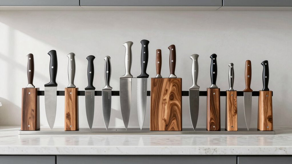 Space-saving knife holders are like hidden gems for small kitchens. I love magnetic strips that cling to the wall, freeing up counter space while keeping knives within easy reach. Compact wooden blocks and wall-mounted racks also do wonders. These options maximize every inch, making your kitchen feel less crowded. Trust me, these clever solutions turn chaos into order, giving you room to breathe and cook with confidence.