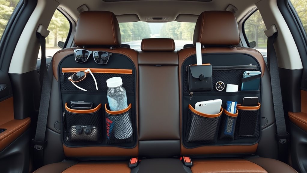 If you want to keep your car tidy and stylish, I recommend checking out the top-rated deluxe seat organizers. They offer durable materials like waterproof polyester and reinforced stitching, plus plenty of compartments for everything from snacks to gadgets. Many models feature adjustable straps, built-in coolers, and tablet holders for convenience. With so many options tailored for families and travelers, you’ll find one that fits your needs perfectly. Keep going to discover which organizer is best for you.