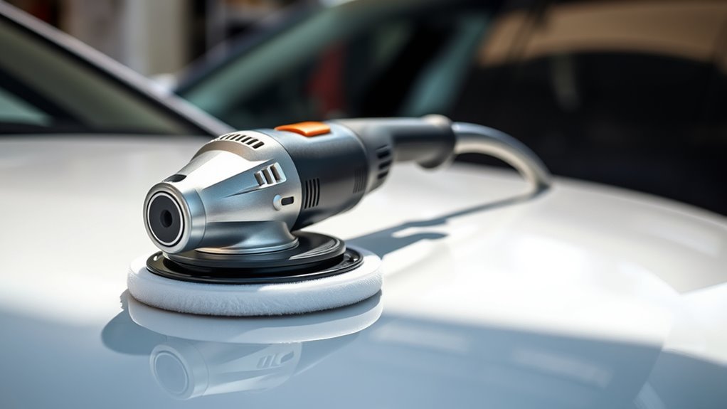 Weight and maneuverability are essential factors that can make or break your polishing experience. Lighter dual action polishers, around 4 to 6 pounds, are easier to handle for extended periods, helping reduce fatigue and improving control. Ergonomic handles and adjustable grips also boost maneuverability, making it simpler to navigate tight spots or tricky surfaces. Heavier models, over 7 pounds, tend to offer more stability but demand more effort to operate, especially during long sessions. Compact designs are advantageous for reaching tight or hard-to-access areas on your vehicle. Additionally, the overall balance and weight distribution influence how easy it is to control the polisher and achieve a smooth, even finish. Choosing the right weight and balance guarantees a more comfortable and precise polishing process.