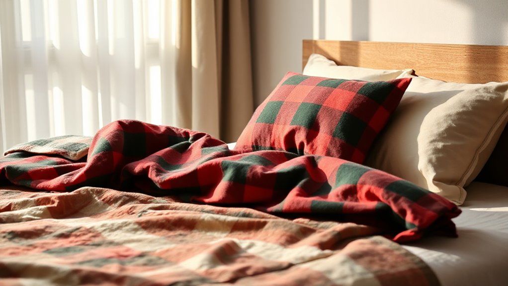 To care for my flannel sheets, I always wash them in cold water on a gentle cycle to prevent pilling. I avoid fabric softeners, which can coat the fibers, and instead use a mild detergent. I tumble dry on low heat or air dry to keep them soft and cozy. Regular washing keeps them fresh, and I fold them neatly to maintain their softness and longevity.