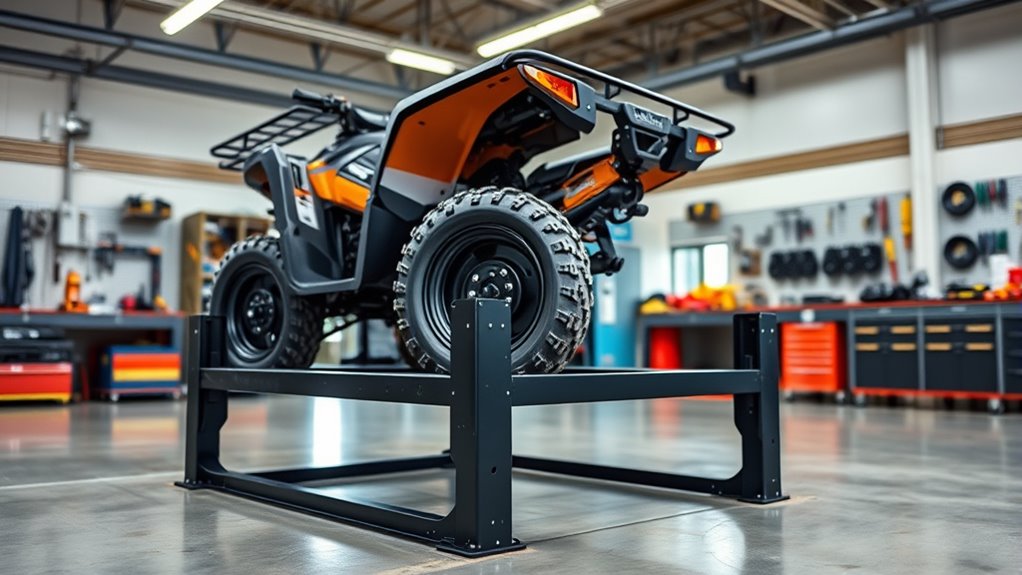 When choosing a heavy-duty ATV lift, durability and material quality should be top priorities because they directly affect the lift’s lifespan and performance. High-quality lifts are built from reinforced steel or heavy-gauge materials, ensuring they withstand repeated use without weakening. The coatings, like powder or rust-resistant paint, protect against corrosion, especially outdoors or in humid environments. Robust welds and reinforced joints are vital for maintaining structural integrity, preventing weak points during lifting. Many models feature thick, non-slip platforms made from durable rubber or textured steel, resistant to impact and wear. Additionally, using high-grade hardware and secure locking mechanisms boosts overall strength and safety, ensuring stability even when lifting maximum loads. These factors are essential for long-term reliability and safe operation.