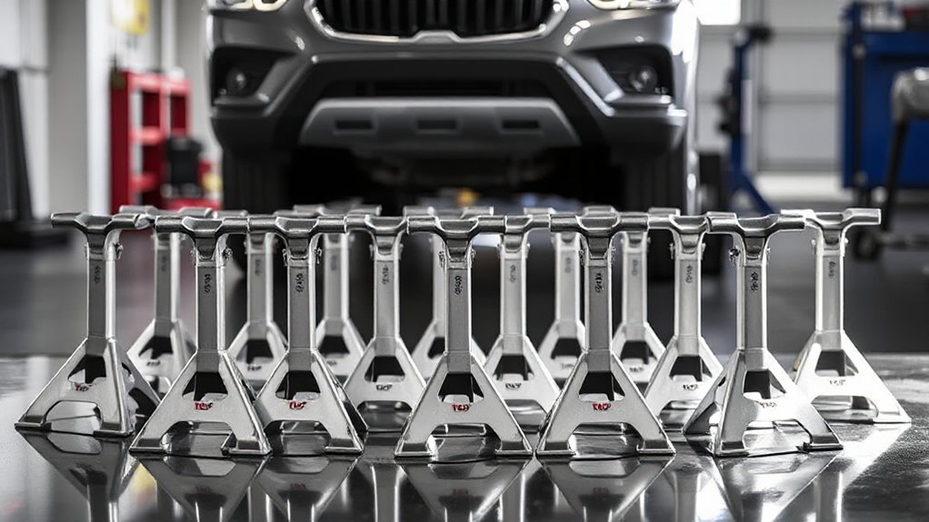 Choosing the right 6-ton jack stand set hinges on compatibility with your vehicles. I always make sure the stands fit the types of vehicles I own, whether they’re cars, SUVs, trucks, or ATVs/UTVs. Each type has unique load capacities and height adjustments, so it’s vital to check those details. I look for adjustable height ranges, ideally between 15 to 24 inches, to match my vehicles’ ground clearance. It’s also essential that the stands can support my vehicle’s total weight since a 6-ton capacity means they can handle up to 13,200 pounds. Features like wide bases and rubber pads enhance stability. Finally, I verify that they meet safety standards like ASME or ANSI for reliable use with my specific vehicle models.