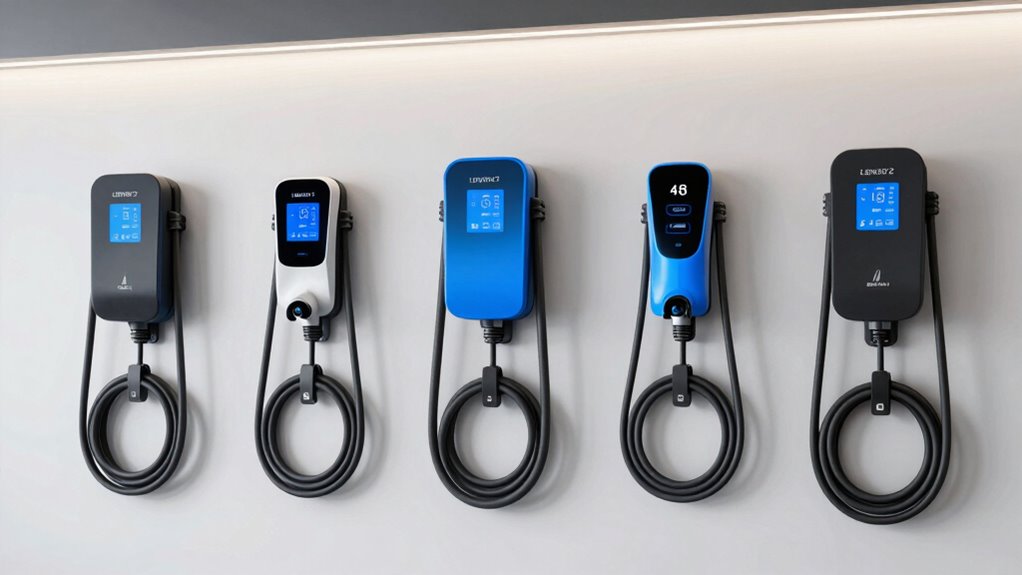 The cost of a Level 2 EV charger can vary widely, often ranging from $400 to $1,200 depending on features like smart technology and charging speed. Fortunately, many states and local governments offer rebates and incentives that can cut costs by 30% or more. Additionally, federal tax credits may cover 30% of the installation expense, up to a specified limit. Keep in mind, installing an EV charger might require electrical upgrades, such as a dedicated circuit or higher amperage service, which can add $500 to $2,000. When evaluating costs, consider long-term savings from faster charging and lower utility rates during off-peak hours. These incentives can greatly reduce your upfront investment and make choosing the right charger more affordable.