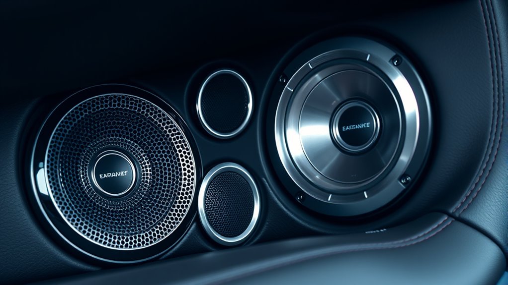 Choosing luxury car speakers that support future upgrades can markedly enhance your audio system’s longevity and adaptability. I look for systems with modular components that can be expanded or customized over time, ensuring my setup evolves with my preferences. For example, 3-way systems that allow adding midrange woofers help improve sound clarity without replacing the entire system. I also verify the availability of additional drivers and accessories compatible with my current setup, making upgrades seamless. Versatile mounting options and shallow structures are important, as they simplify future modifications and installation. Equally *essential* is selecting speakers that maintain their aesthetic appeal and performance quality when upgrading individual parts or expanding the system, ensuring my investment remains both functional and stylish over time.