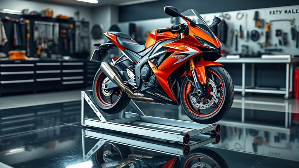 These lifts are primarily designed for maintenance, but I’ve found they can also be great for storage if you’re careful. Just make sure the lift’s weight capacity isn’t exceeded and that it’s stable before leaving your motorcycle on it. I recommend using it for short-term storage rather than long periods. Always follow the manufacturer’s guidelines to guarantee safety and preserve the lift’s longevity.