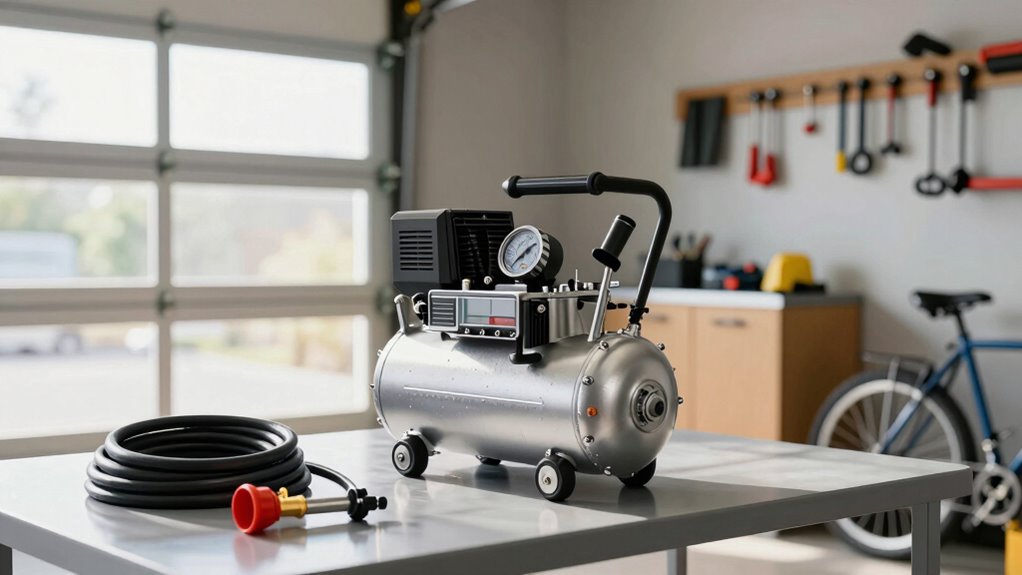 When shopping for a portable air compressor, considering its size and weight is essential because these factors directly impact how easily you can move and store the unit. Lighter models, around 19 pounds, are perfect for quick transport and minimal effort, while heavier units over 70 pounds may require wheels or handles for easier mobility. Compact designs under 20 inches in length fit comfortably in tight garage spaces or vehicle trunks, making storage hassle-free. Handles, wheels, and integrated carry features considerably improve maneuverability, especially for heavier models. Smaller tanks, like 2-4 gallons, boost portability but might need more frequent refills for extended tasks. Ultimately, size and weight influence how conveniently you can transport and store your compressor, ensuring it fits your garage setup and work demands.