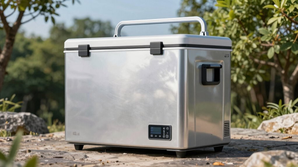 Durability and material quality are vital factors to evaluate for a portable refrigerator freezer, especially if you plan to take it on rugged outdoor adventures. I look for models built with heavy-duty materials like solid steel housing or durable plastics, which boost longevity and resist outdoor conditions. A stain-resistant exterior helps protect against scratches and keeps the unit looking new over time. Shock-proof designs are imperative, guaranteeing stability on uneven surfaces during off-road trips or outdoor activities. Some refrigerators feature a frosted, bumpy exterior that minimizes visible scratches and provides a better grip when handling. Additionally, I check for safety and reliability certifications, as these often signal adherence to high-quality standards in materials and construction. All these aspects help confirm my investment withstands tough environments.