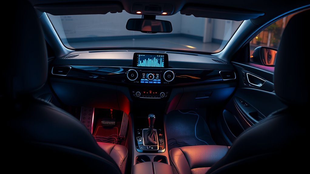 To keep your premium car audio performing well long-term, I recommend regular checks and maintenance. Clean the speakers and connections to prevent dust buildup, and guarantee the wiring stays secure. I also suggest avoiding excessive volume to prevent damage. Additionally, I schedule periodic professional system tuning and firmware updates if applicable. This way, your audio stays crisp, clear, and reliable, making every drive an enjoyable experience.