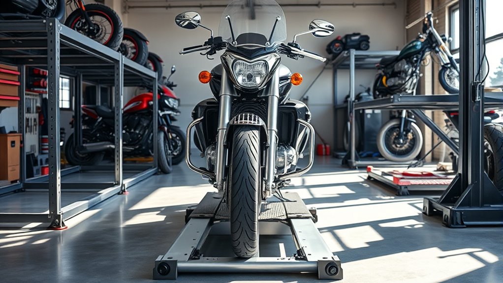 Selecting a motorcycle lift that suits your bike’s specific type is vital for safe and effective maintenance. First, confirm the lift’s weight capacity exceeds your heaviest motorcycle, including gear and accessories. Check the platform size and support fixtures to fit different frame shapes and wheelbases. Compatibility with specific bike types—like cruisers, sport bikes, touring bikes, or off-road models—is essential, especially considering ground clearance and frame design. Look for adjustable support features, such as removable or customizable supports, to accommodate bikes with varying widths, spools, or solid support points. Additionally, verify if the lift works with accessories like wheel chocks, tie-downs, or custom supports, ensuring versatile use tailored to your motorcycle’s unique characteristics.