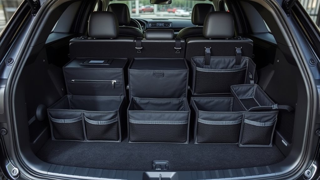 To guarantee your trunk organizer stays securely in place during drives, paying attention to stability and anti-slip features is essential. Look for organizers with non-slip bases made of silicone pads or textured fabrics that grip the trunk surface, preventing shifting. Adjustable straps and securing belts are also crucial, as they keep the organizer firmly anchored, even on bumpy roads. Reinforced side panels and rigid internal supports add extra stability, especially when carrying heavier loads. Anti-slip elements like Velcro strips or rubber feet help maintain the organizer’s position on various surfaces, whether carpeted or rubber mats. These stability features not only keep your items safe but also protect your vehicle’s interior from damage caused by shifting cargo.