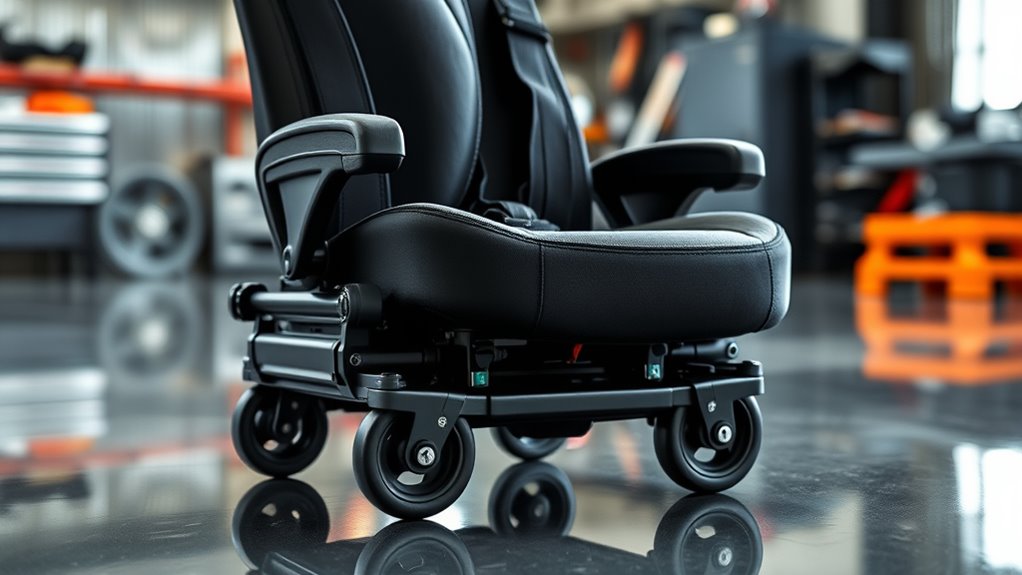 Mobility and maneuverability are key factors I consider to guarantee a premium creeper seat performs well in tight or cluttered spaces. I look for models with swivel casters that spin 360°, making it easy to navigate around obstacles. Lockable wheels are essential for stability when I need to stay in place during detailed work or when working on a vehicle. The size and number of wheels also matter—larger or more casters help create smoother, effortless movement. I prefer non-marring materials for the wheels to avoid damaging flooring surfaces. Additionally, I check if the design allows for quick, easy directional changes without requiring too much effort. Good mobility ensures I can work comfortably and efficiently in confined or cluttered environments.