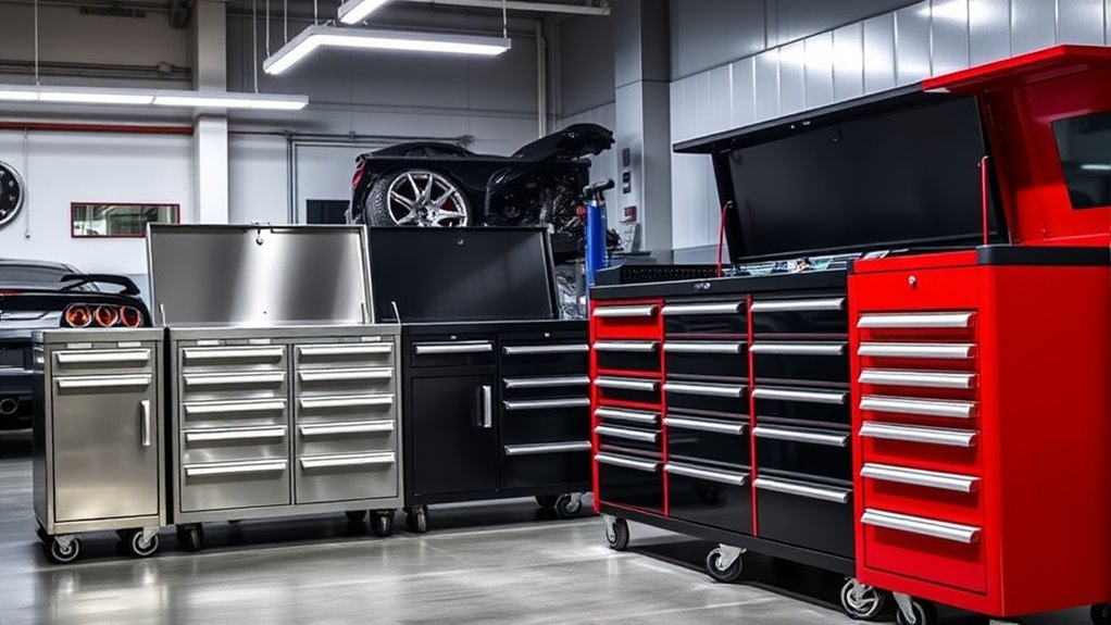 Stainless steel and heavy-duty steel are top materials that guarantee durability in professional automotive tool chests. I prefer steel because it’s tough, resists corrosion, and withstands daily wear and tear. Reinforced corners and sturdy locking mechanisms also add to their longevity. When choosing a chest, I look for high-quality steel, welded seams, and rust-resistant finishes, so my tools stay protected and the chest lasts for years.