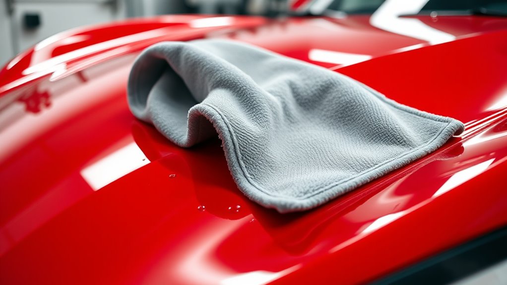 Think of drying your car like treading carefully through a field of delicate flowers. I start by gently dabbing with a high-quality microfiber towel, avoiding any dragging or harsh motions. I work from top to bottom, frequently flipping or changing towels to keep them dry. This method guarantees I don’t miss spots or risk scratches, giving my car that flawless, mirror-like finish every time.