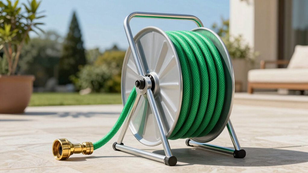 I regularly inspect my retractable hose reel for any signs of wear or damage. I clean the reel and hose with mild soap and water to prevent buildup. It’s vital to lubricate moving parts, like the retraction mechanism, to guarantee smooth operation. I also check for leaks and tighten fittings if needed. Proper maintenance keeps my reel working efficiently and extends its lifespan.