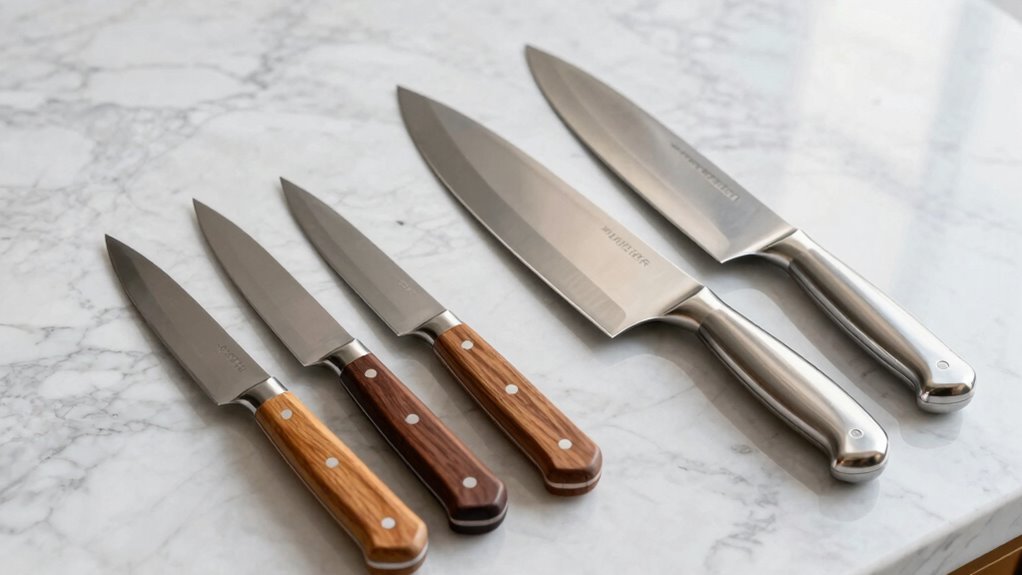 When selecting between a Santoku and a chef knife set, handle ergonomics play a key role in ensuring comfort and control during use. A well-designed handle reduces wrist strain and provides a natural fit, making long chopping sessions less tiring. Handles with textured or rubberized surfaces improve safety by preventing slips, even when wet. The shape of the handle—whether rounded, oval, or octagonal—also affects how comfortably it fits in your hand and how easily you can maneuver the knife. Full tang handles offer better balance and durability, giving you more stability during cutting tasks. Additionally, proper handle weight in relation to the blade minimizes fatigue, allowing for more precise cuts over extended periods. Ergonomic handles are essential for a comfortable, safe, and efficient kitchen experience.