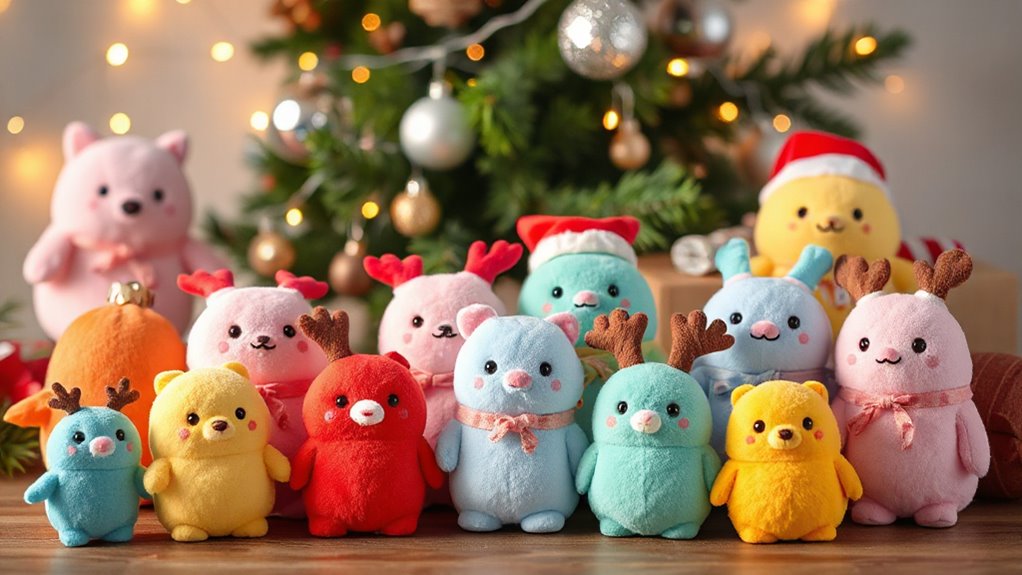 Considering the factors that influence a Squishmallow’s long-term value can turn a simple holiday gift into a treasured collectible. Limited edition releases from the 2025 collection, especially holiday-themed characters, often hold higher future value due to their rarity. The exclusivity of seasonal releases makes them more desirable and likely to appreciate over time. Authenticity seals and official branding are essential for verifying a Squishmallow’s collectibility and maintaining its worth. Variations in size, unique designs, and seasonal accessories also boost their appeal to collectors. Additionally, keeping your Squishmallows in pristine condition—preserving tags and avoiding damage—ensures they retain their value. These factors help you identify which holiday Squishmallows could become prized collectibles down the line.