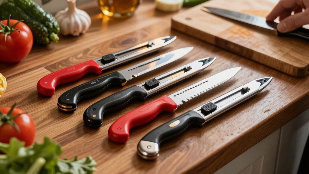 You’d think safety features are obvious, but surprisingly, not everyone checks for them. Look for a knife with a secure, locking mechanism on the blade to prevent accidental slips. An ergonomic, non-slip handle adds grip and control, reducing mishaps. A blade guard or sheath protects both you and the blade when not in use. These features keep your fingers safe and your kitchen accident-free, even during busy cooking sessions.