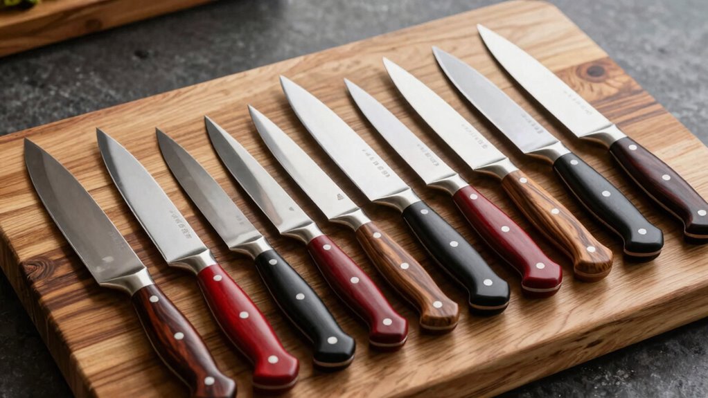 Imagine holding a trusty steed—your knife’s handle determines how smoothly you ride through your prep work. Handle material greatly influences both durability and comfort; a sturdy, high-quality grip resists wear and provides a secure hold, even after hours of chopping. I’ve found that materials like pakkawood or composite handles beautifully balance strength and comfort, making my knife feel like an extension of my hand—a reliable partner in the kitchen.